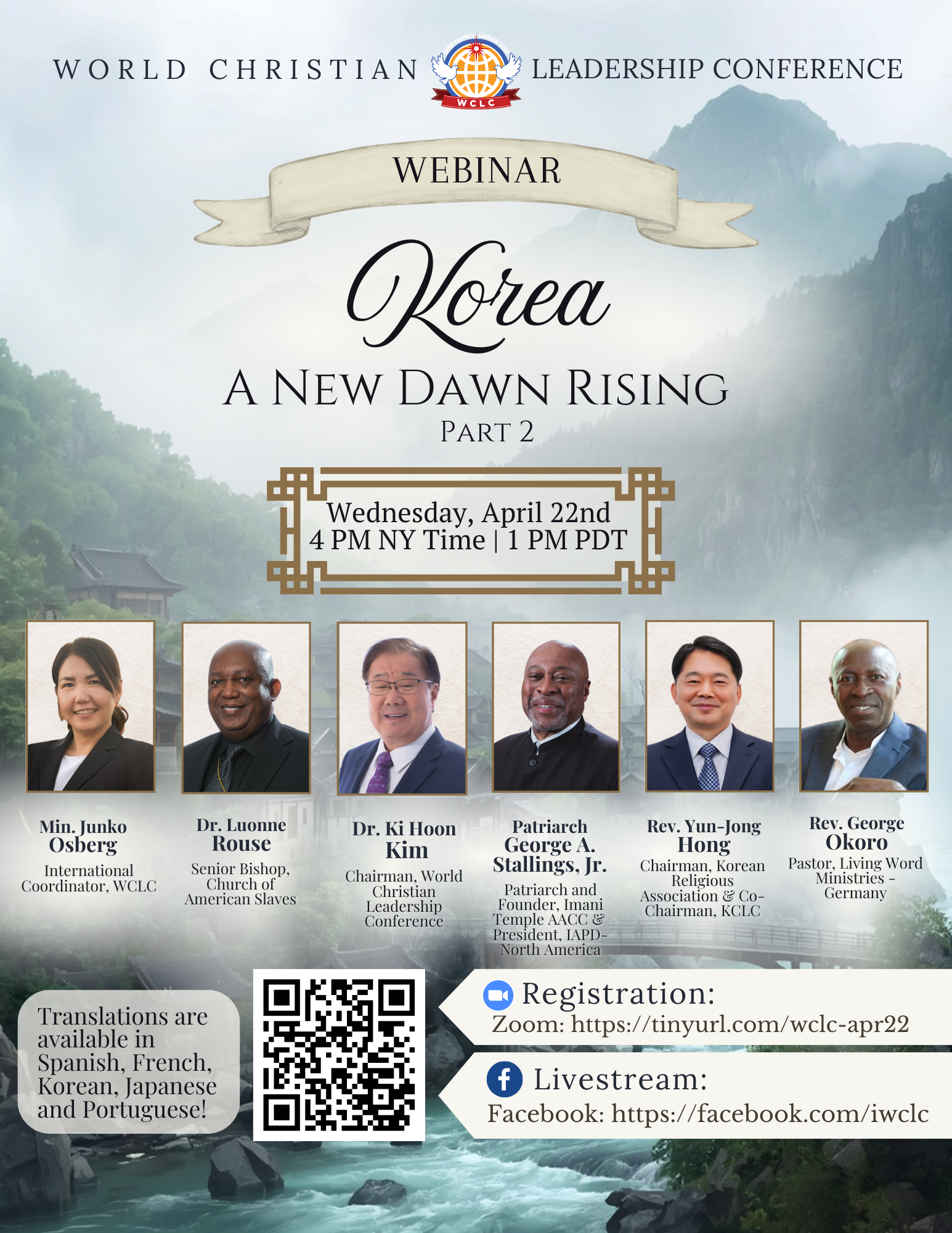 This month, WCLC's webinar will continue to highlight messages and testimonies from our prayer assembly in Korea February 2026. Ministers, who received presentations about the Chosen Han People of Korea, share their reflections and experiences. Min. Junko Osberg will be the MC. Dr. Ki Hoon Kim will give the welcoming remarks. We will watch messages from three respected clergy who joined us: Dr. Luonne Rouse, Patriarch George A. Stallings, Jr., and Rev. George Okoro. We will then hear a message from the Chairman of KRA who hosted us, Rev. Yun-Jong Hong.